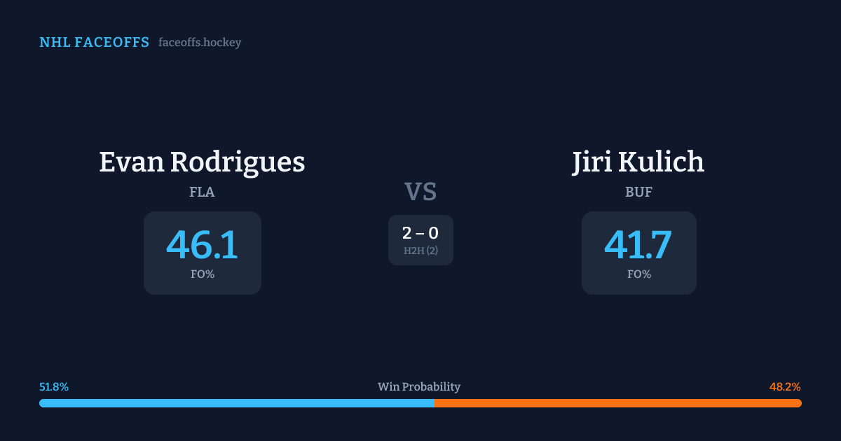 These two are closely matched in overall FO% (45.0% vs 45.5%). Look for Rodrigues on defensive-zone draws (75% H2H, 4 meetings). Rodrigues wins 42.6% vs left-shot opponents — Kulich shoots left.