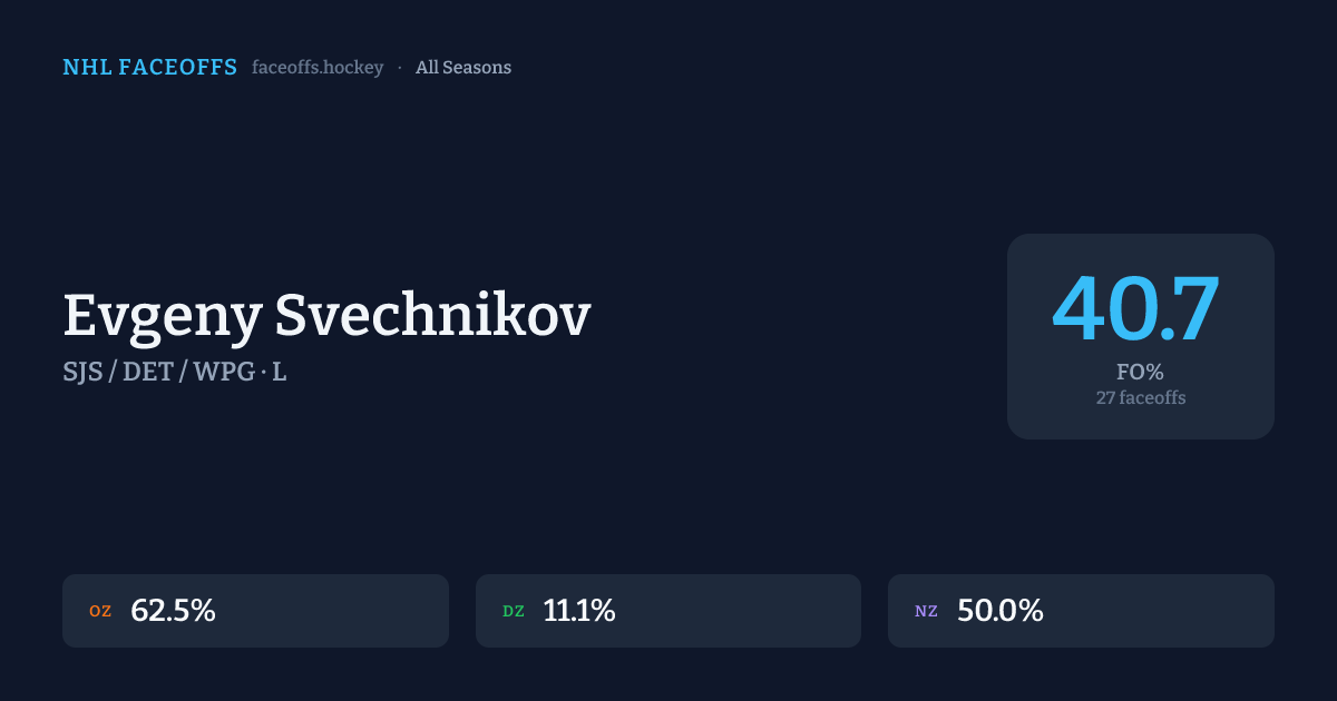 Evgeny Svechnikov has a 2021-22 faceoff win percentage of 42.9% across 7 faceoffs in the 2021-22 season. Best zone: Neutral (50.0%).