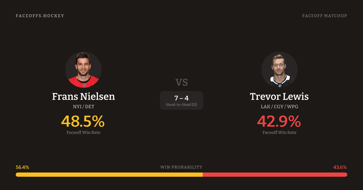 Frans Nielsen holds a +7.0% FO% edge overall. Look for Nielsen on offensive-zone draws (100% H2H, 3 meetings). Nielsen wins 46.9% vs right-shot opponents — Lewis shoots right.