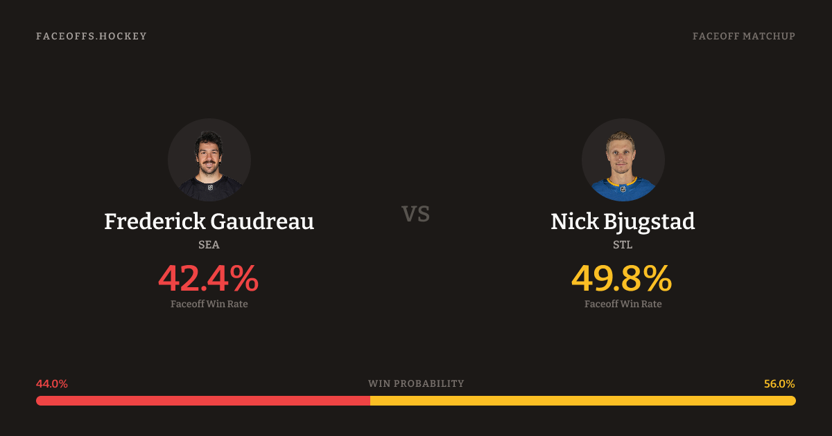 Frederick Gaudreau holds a +1.5% FO% edge overall. Look for Gaudreau on neutral-zone draws (83% H2H, 6 meetings). Gaudreau wins 46.1% vs right-shot opponents — Bjugstad shoots right.