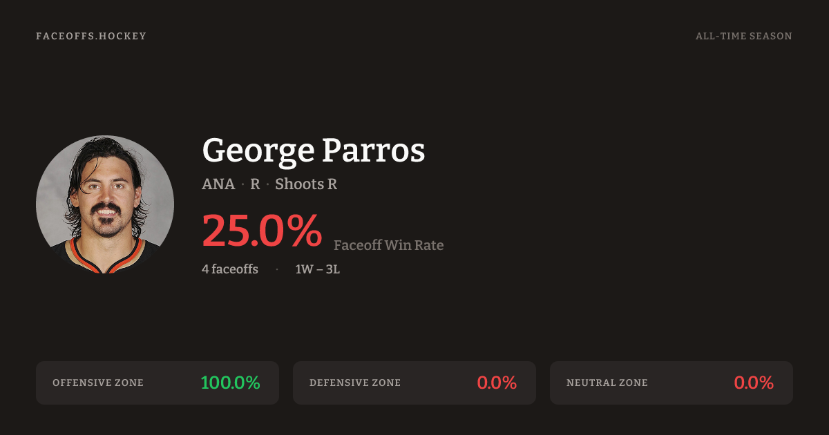 George Parros has a career faceoff win percentage of 25.0% across 4 faceoffs. Best zone: Offensive (100.0%).