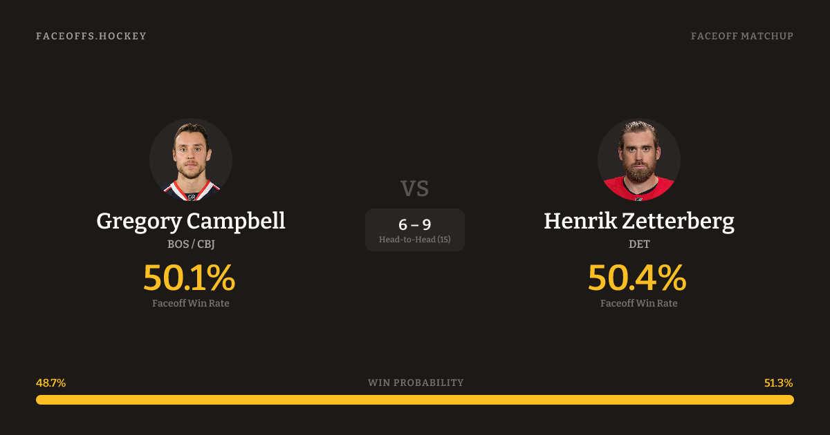 Gregory Campbell holds a +2.8% FO% edge overall. Look for Zetterberg on offensive-zone draws (83% H2H, 6 meetings).