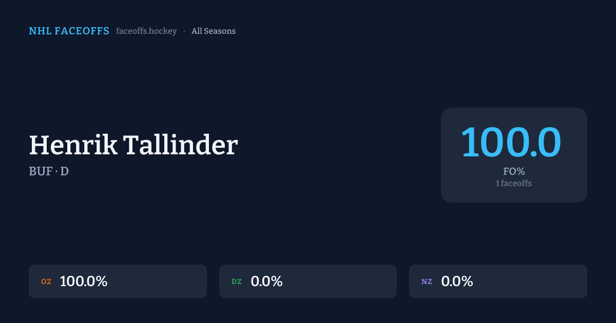 Henrik Tallinder has a career faceoff win percentage of 100.0% across 1 faceoffs. Best zone: Offensive (100.0%).