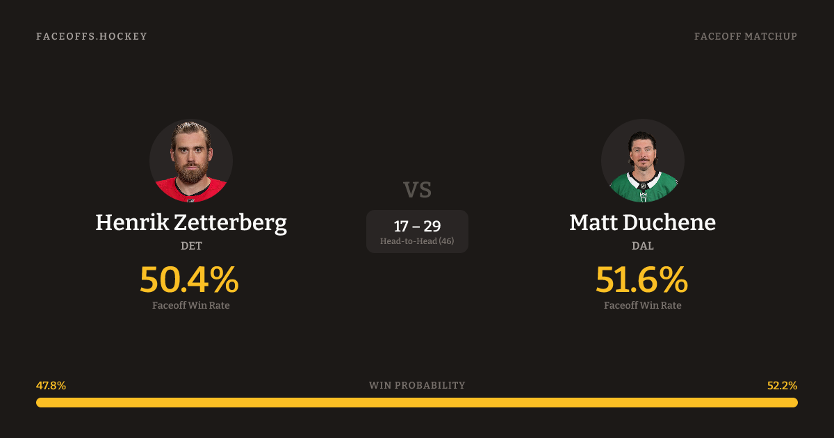 Matt Duchene holds a +3.8% FO% edge overall. Look for Duchene on defensive-zone draws (92% H2H, 12 meetings).
