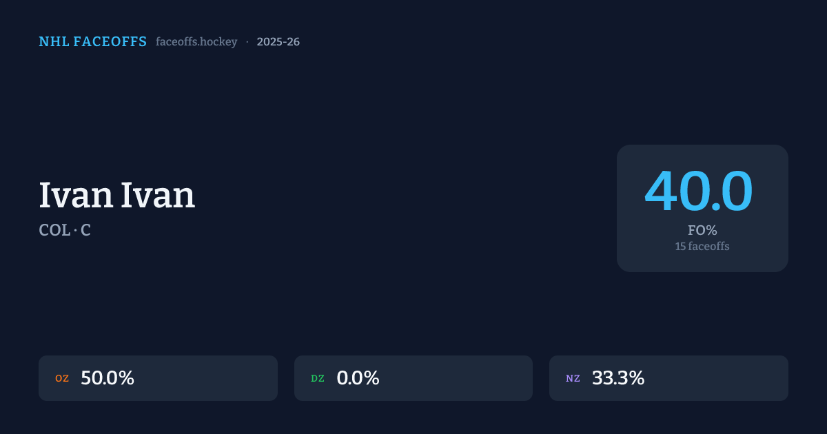 Ivan Ivan has a 2025-26 faceoff win percentage of 40.0% across 15 faceoffs in the 2025-26 season. Best zone: Offensive (50.0%).