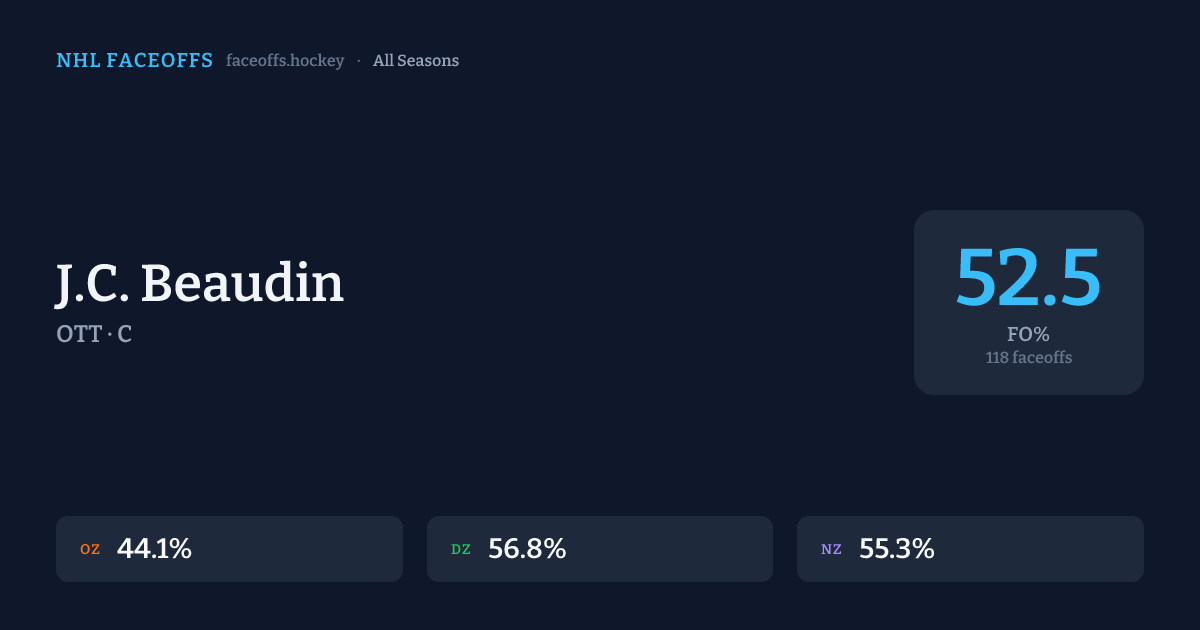 J.C. Beaudin has a career faceoff win percentage of 52.5% across 118 faceoffs. Best zone: Defensive (56.8%).