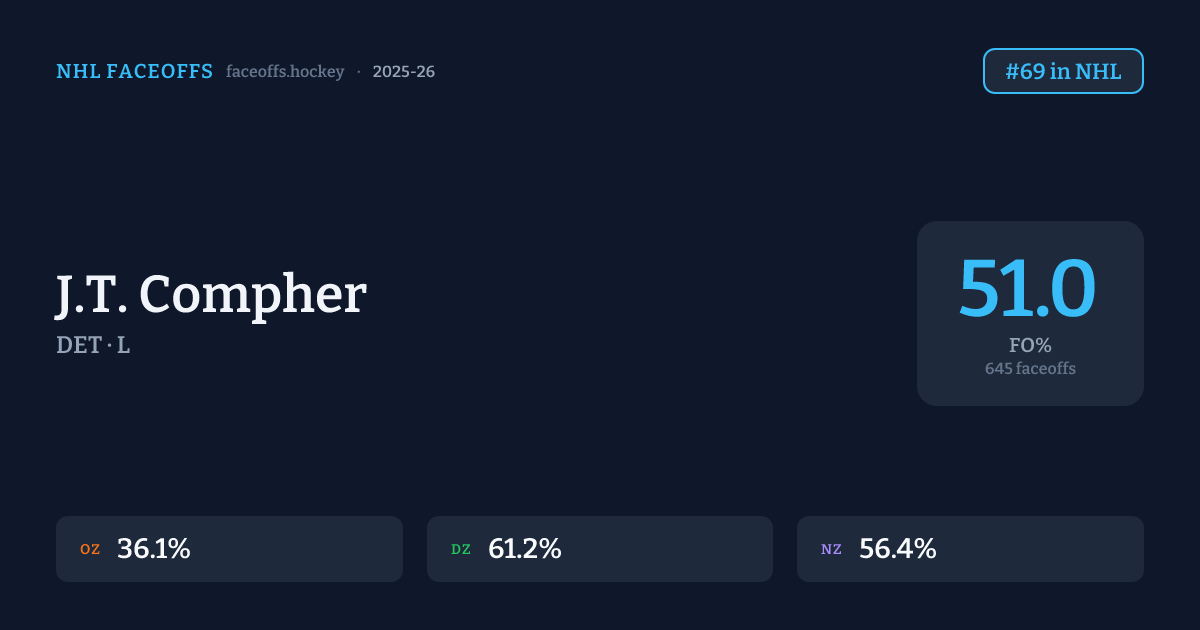J.T. Compher has a 2025-26 faceoff win percentage of 51.0% across 645 faceoffs in the 2025-26 season. Best zone: Defensive (61.2%). Ranked #69 in the league.