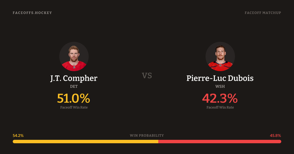 J.T. Compher holds a +4.5% FO% edge overall. Look for Compher on defensive-zone draws (88% H2H, 8 meetings).