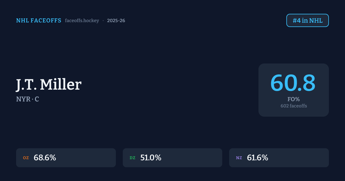 J.T. Miller has a 2025-26 faceoff win percentage of 60.8% across 602 faceoffs in the 2025-26 season. Best zone: Offensive (68.6%). Ranked #4 in the league.