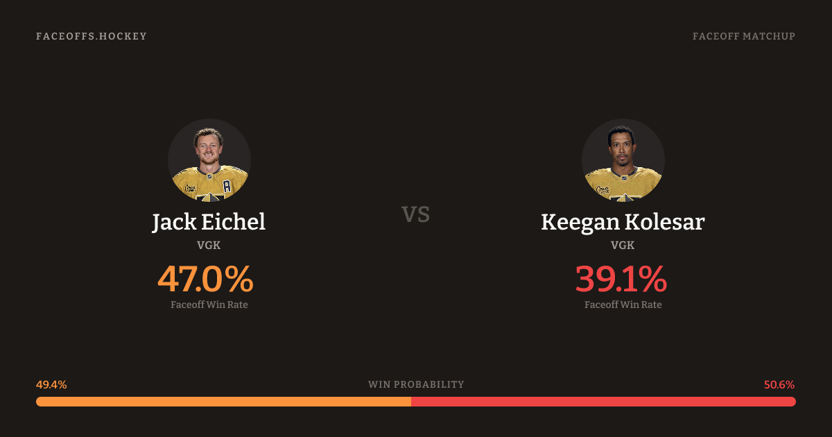 Eichel shoots right. Kolesar is 66.7% vs right-shot opponents (3).