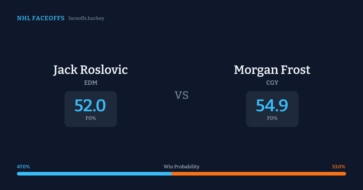 These two are closely matched in overall FO% (45.0% vs 45.8%). Look for Roslovic on defensive-zone draws (80% H2H, 5 meetings). Roslovic wins 45.8% vs left-shot opponents — Frost shoots left.
