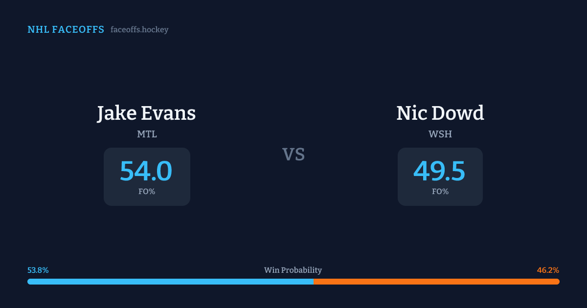 Jake Evans holds a +1.2% FO% edge overall. Look for Dowd on defensive-zone draws (75% H2H, 4 meetings). Evans wins 56.8% vs right-shot opponents — Dowd shoots right.