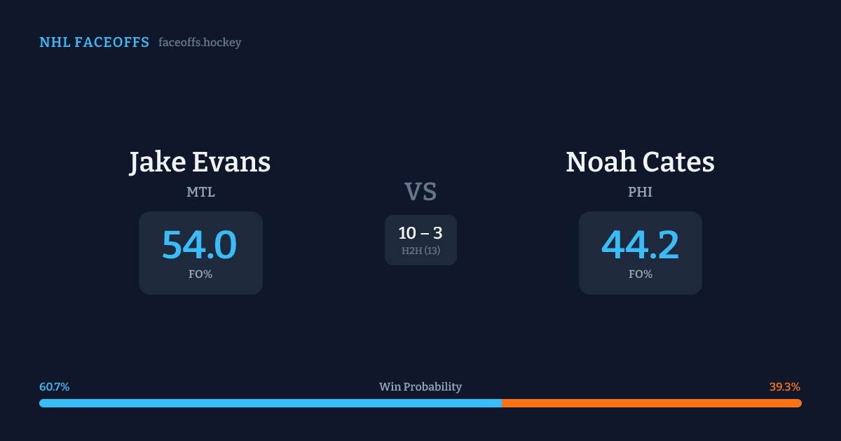Jake Evans holds a +10.1% FO% edge overall. Look for Evans on defensive-zone draws (88% H2H, 8 meetings). Evans wins 53.4% vs left-shot opponents — Cates shoots left.