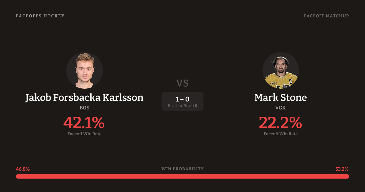 Stone shoots right. Karlsson is 51.7% vs right-shot opponents (58).
