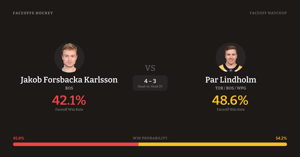 Par Lindholm holds a +8.1% FO% edge overall. Karlsson wins 39.1% vs left-shot opponents — Lindholm shoots left.