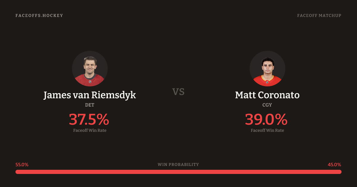 Riemsdyk shoots left. Coronato is 36.2% vs left-shot opponents (105).