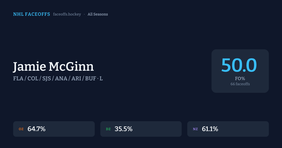 Jamie McGinn has a 2018-19 faceoff win percentage of 100.0% across 1 faceoffs in the 2018-19 season. Best zone: Neutral (100.0%).