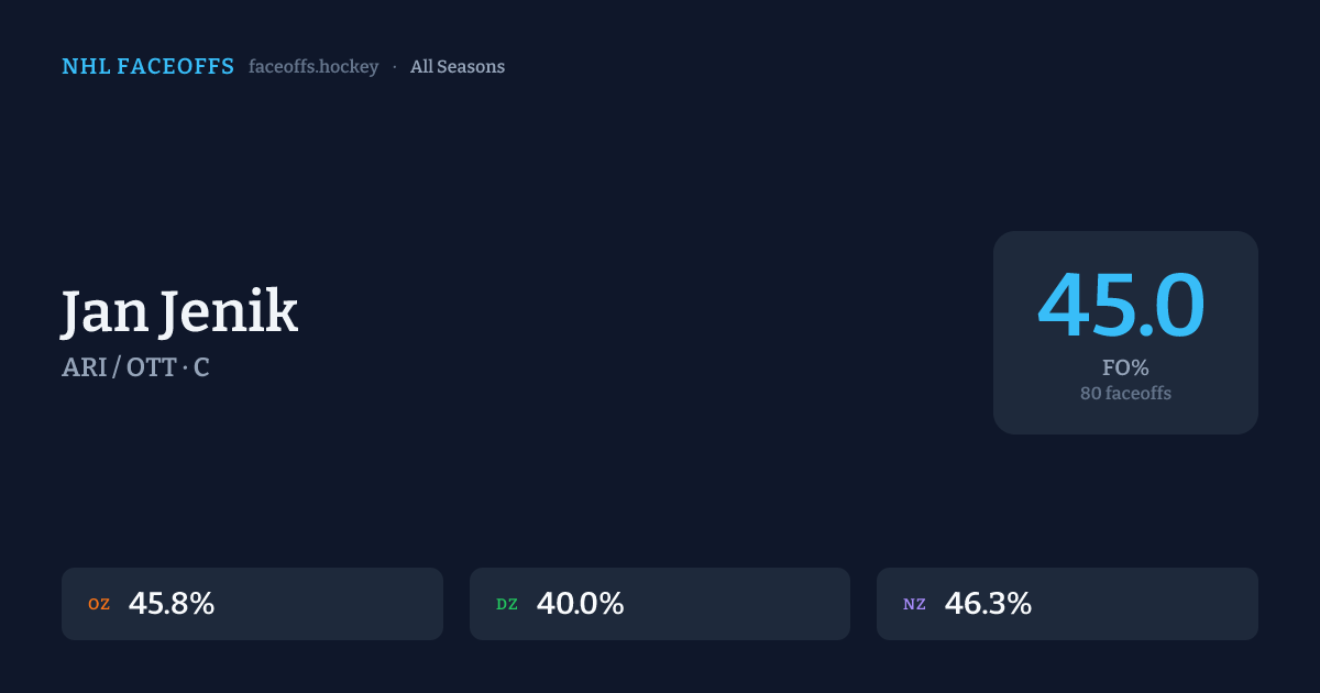 Jan Jenik has a 2022-23 faceoff win percentage of 20.0% across 5 faceoffs in the 2022-23 season. Best zone: Neutral (50.0%).