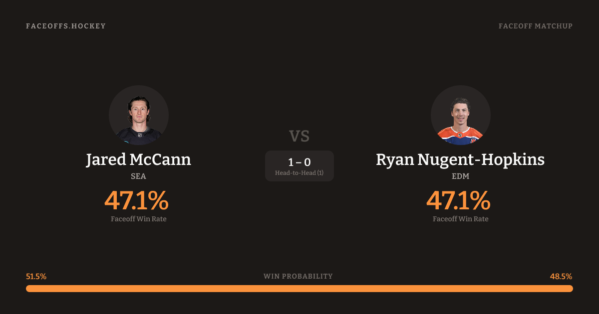 Jared McCann holds a +1.1% FO% edge overall. Look for Nugent-Hopkins on neutral-zone draws (100% H2H, 5 meetings). McCann wins 45.1% vs left-shot opponents — Nugent-Hopkins shoots left.