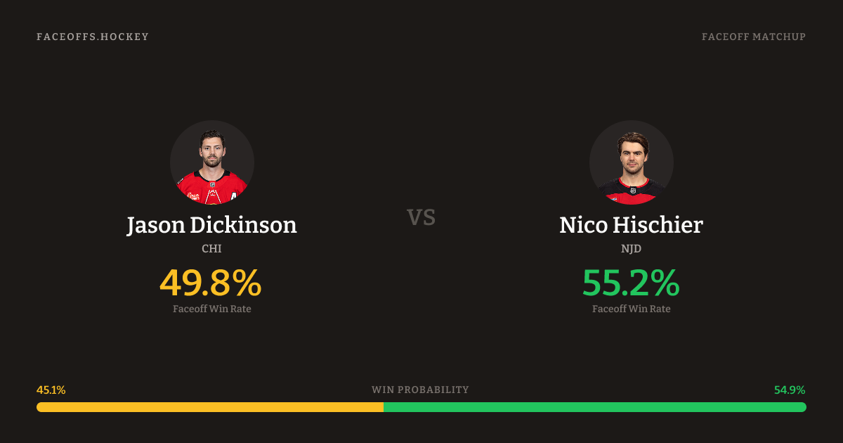 Nico Hischier holds a +4.9% FO% edge overall. Look for Hischier on offensive-zone draws (100% H2H, 8 meetings). Dickinson wins 46.0% vs left-shot opponents — Hischier shoots left.