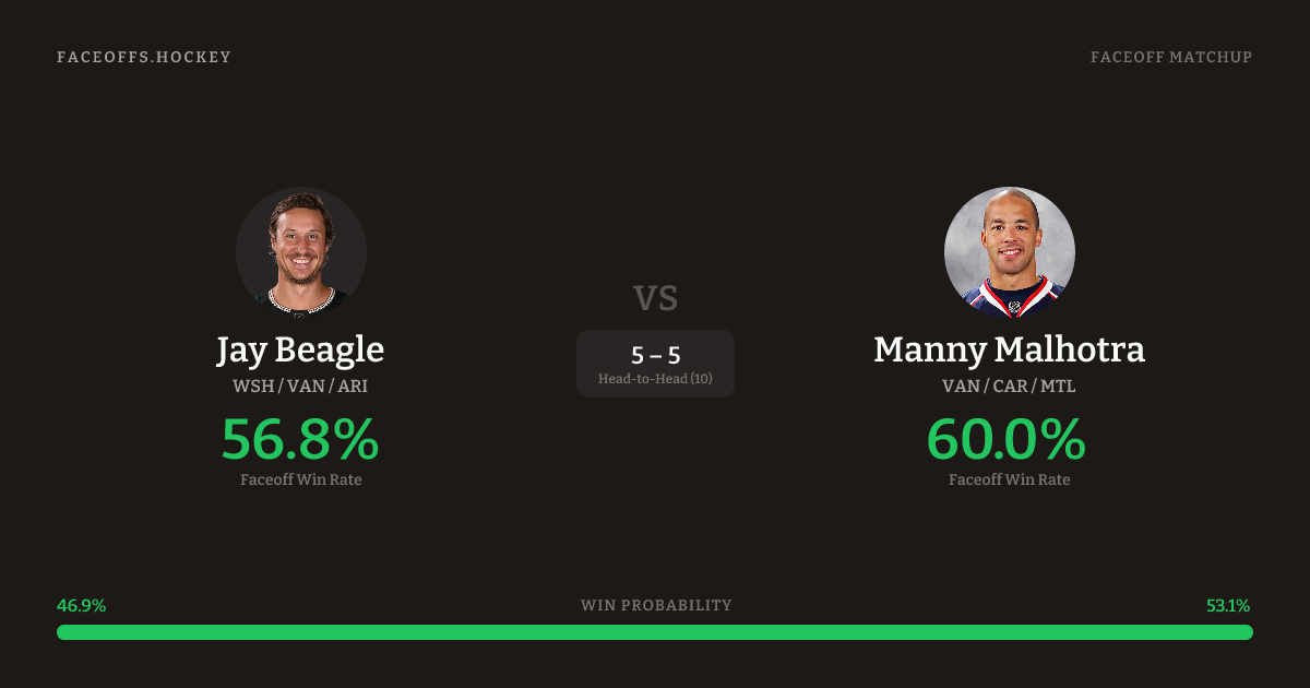 Manny Malhotra holds a +3.2% FO% edge overall. Look for Beagle on offensive-zone draws (100% H2H, 3 meetings). Beagle wins 57.0% vs left-shot opponents — Malhotra shoots left.