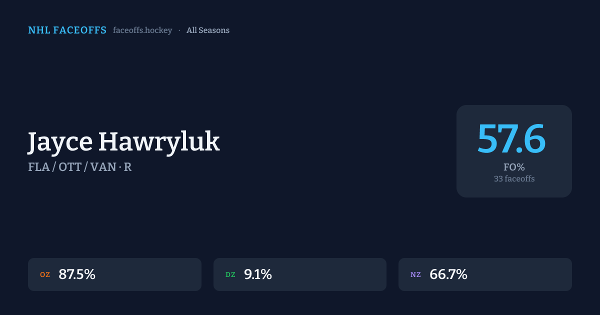 Jayce Hawryluk has a 2019-20 faceoff win percentage of 33.3% across 12 faceoffs in the 2019-20 season. Best zone: Neutral (100.0%).
