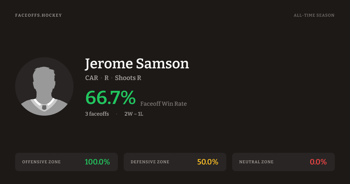 Jerome Samson has a career faceoff win percentage of 66.7% across 3 faceoffs. Best zone: Offensive (100.0%).