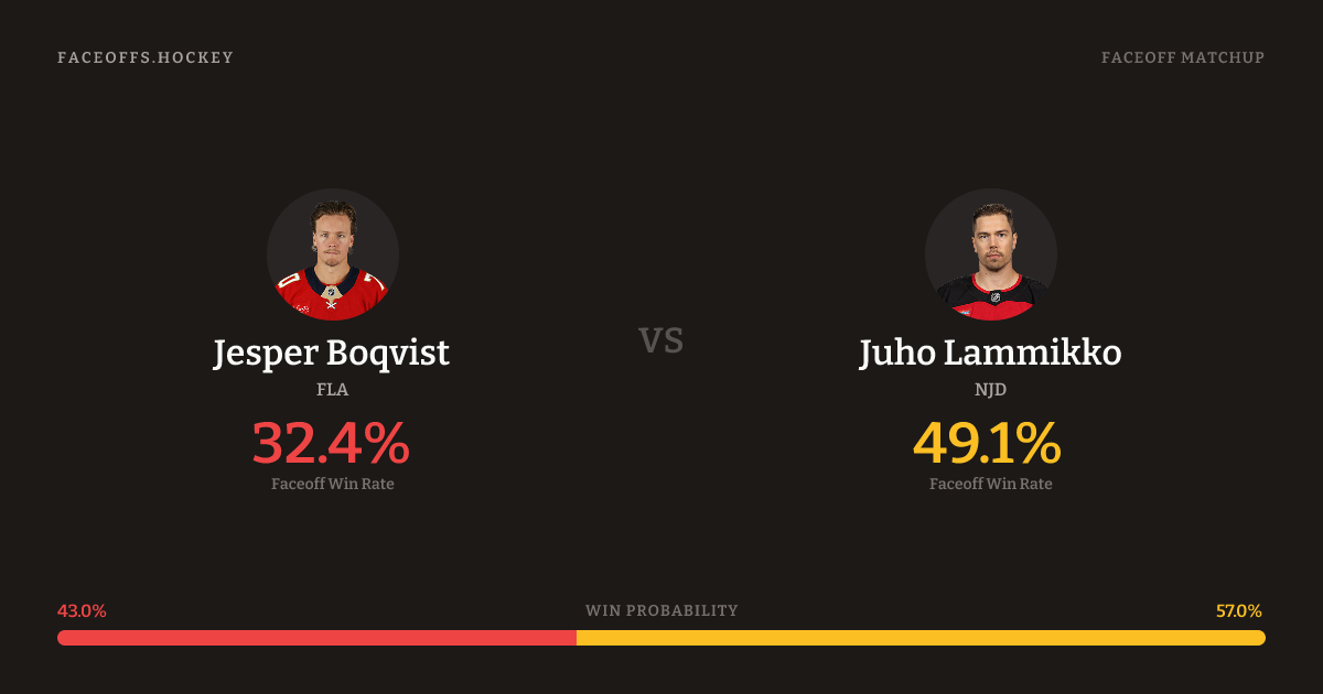Juho Lammikko holds a +13.7% FO% edge overall. Look for Boqvist on neutral-zone draws (75% H2H, 4 meetings). Boqvist wins 40.1% vs left-shot opponents — Lammikko shoots left.