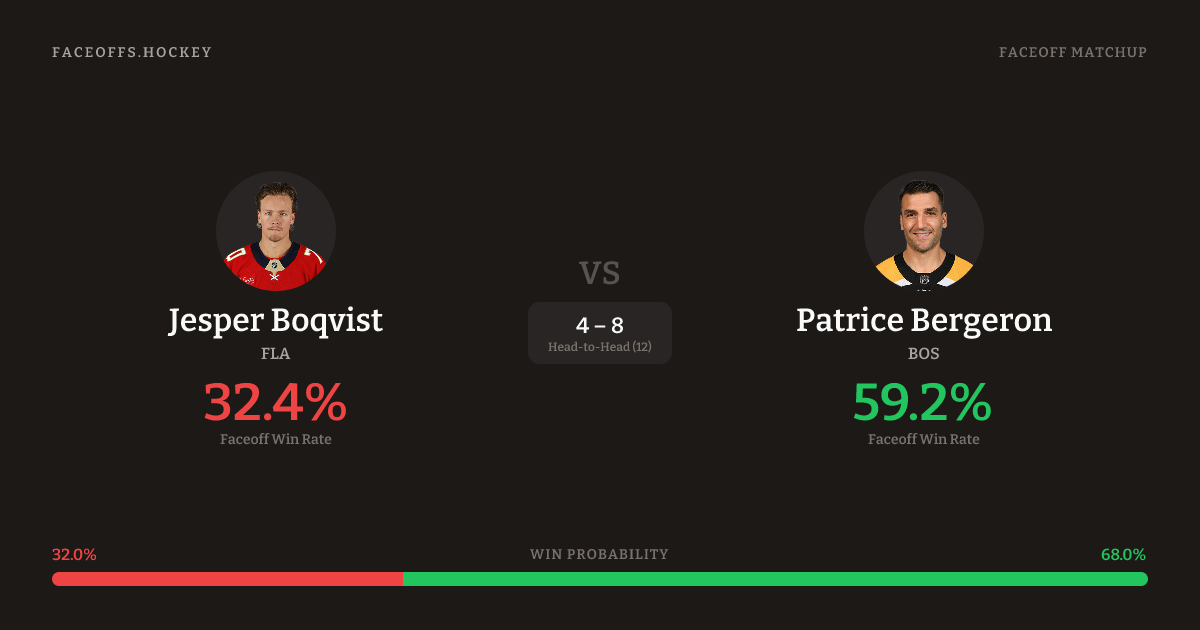 Patrice Bergeron holds a +24.6% FO% edge overall. Look for Bergeron on defensive-zone draws (60% H2H, 5 meetings). Boqvist wins 32.3% vs right-shot opponents — Bergeron shoots right.