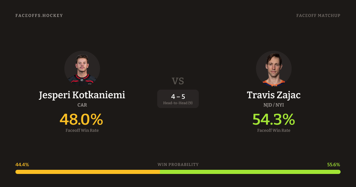 Travis Zajac holds a +10.0% FO% edge overall. Look for Kotkaniemi on neutral-zone draws (67% H2H, 3 meetings). Kotkaniemi wins 43.4% vs right-shot opponents — Zajac shoots right.