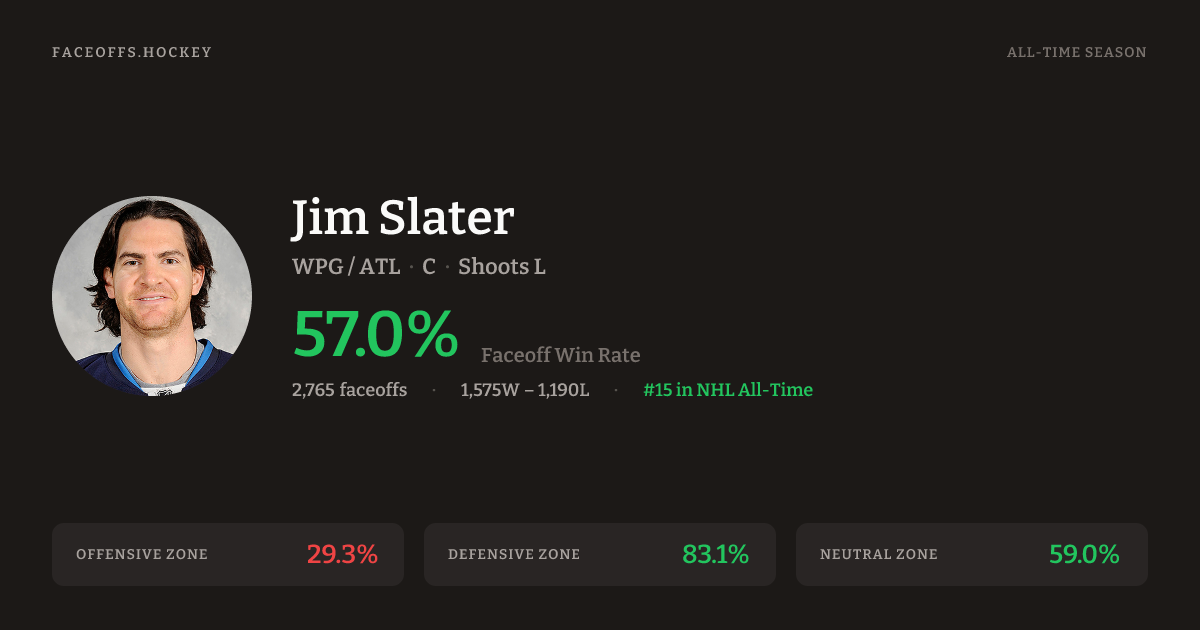 Jim Slater has a career faceoff win percentage of 56.8% across 2,801 faceoffs. Best zone: Defensive (83.2%). Ranked #19 in the league.