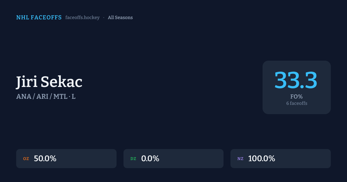 Jiri Sekac has a career faceoff win percentage of 33.3% across 6 faceoffs. Best zone: Neutral (100.0%).