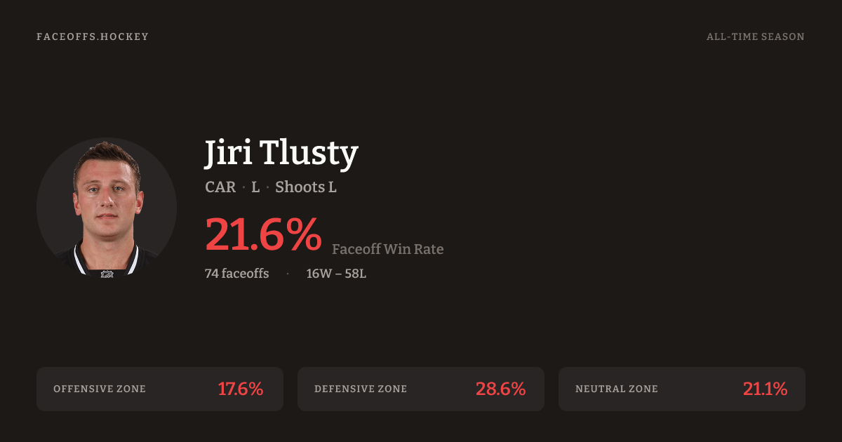 Jiri Tlusty has a career faceoff win percentage of 21.6% across 74 faceoffs. Best zone: Defensive (28.6%).