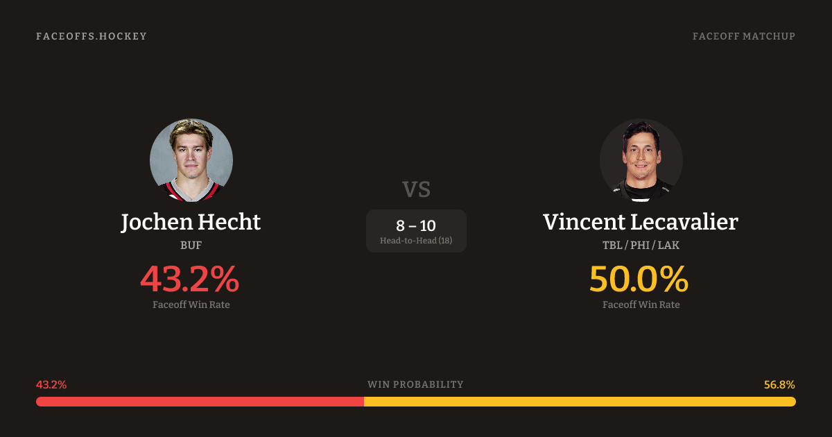 Vincent Lecavalier holds a +12.8% FO% edge overall. Look for Hecht on neutral-zone draws (67% H2H, 3 meetings). Hecht wins 43.1% vs left-shot opponents — Lecavalier shoots left.
