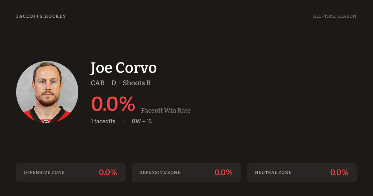Joe Corvo has a career faceoff win percentage of 0.0% across 1 faceoffs. Best zone: Neutral (0.0%).