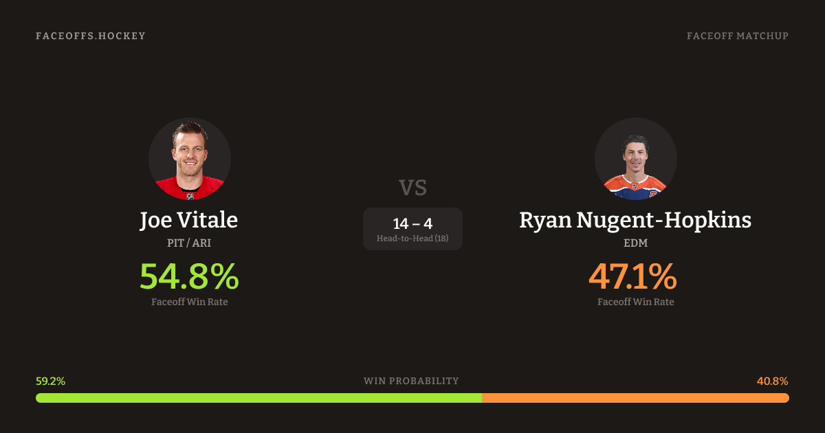 Joe Vitale holds a +2.6% FO% edge overall. Look for Vitale on defensive-zone draws (100% H2H, 7 meetings).