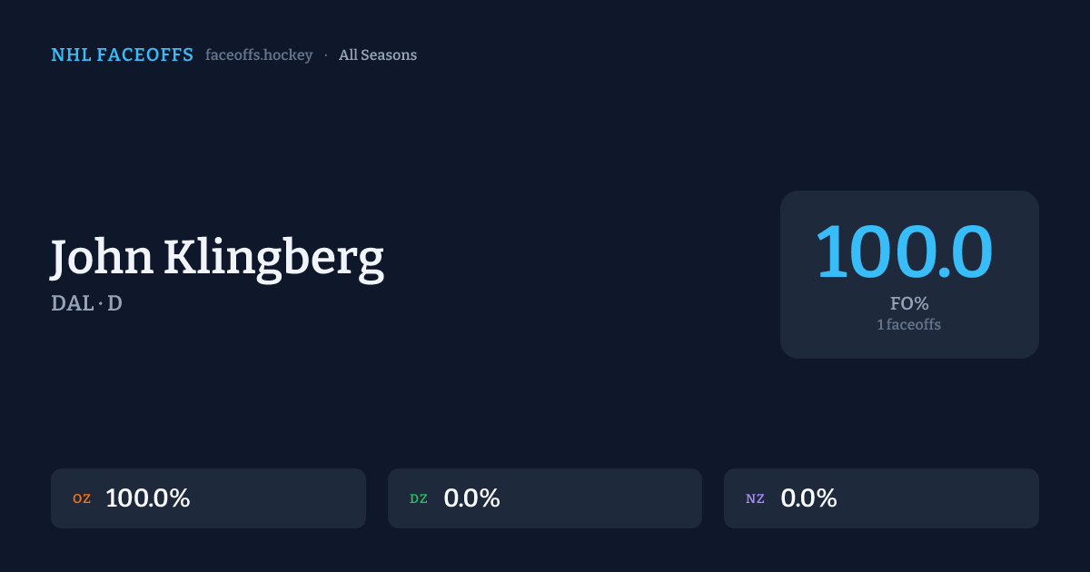John Klingberg has a 2016-17 faceoff win percentage of 100.0% across 1 faceoffs in the 2016-17 season. Best zone: Offensive (100.0%).