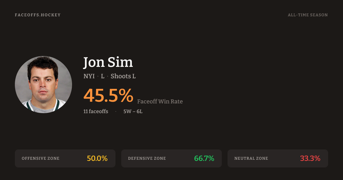 Jon Sim has a career faceoff win percentage of 45.5% across 11 faceoffs. Best zone: Defensive (66.7%).