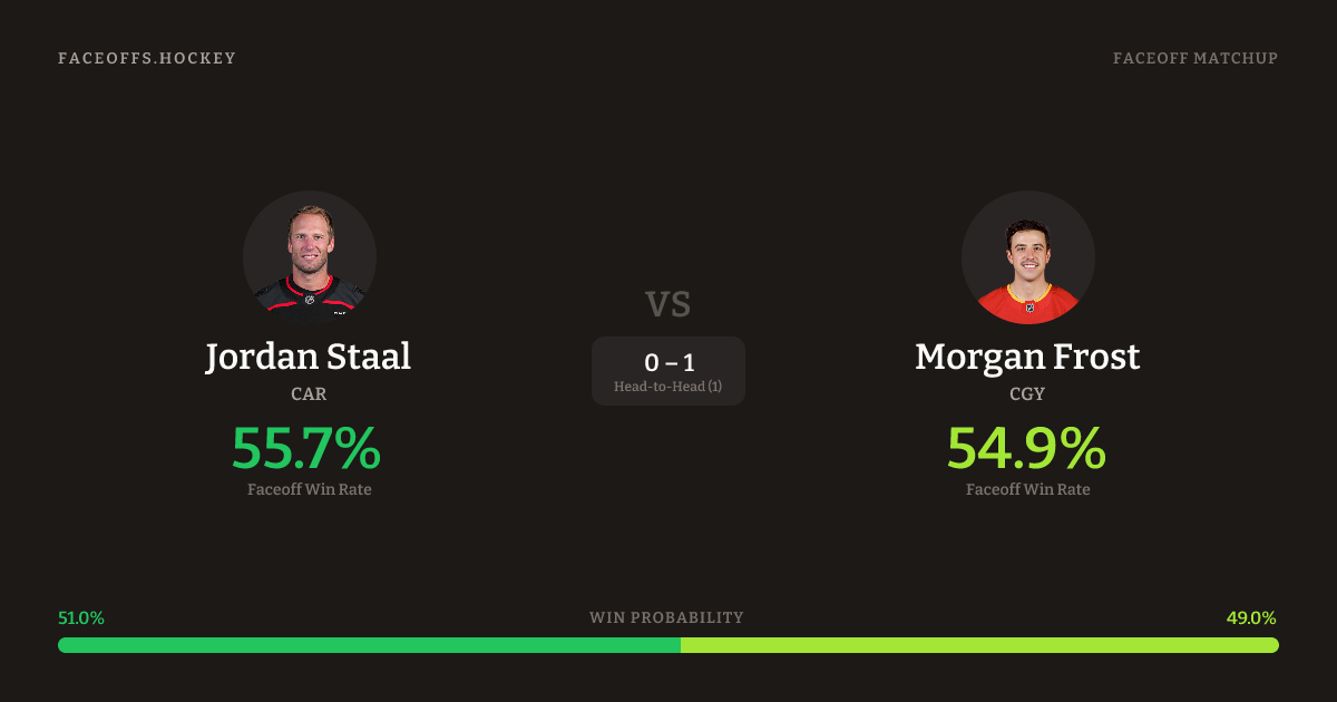 Jordan Staal holds a +3.3% FO% edge overall. Look for Frost on offensive-zone draws (100% H2H, 4 meetings). Staal wins 53.2% vs left-shot opponents — Frost shoots left.
