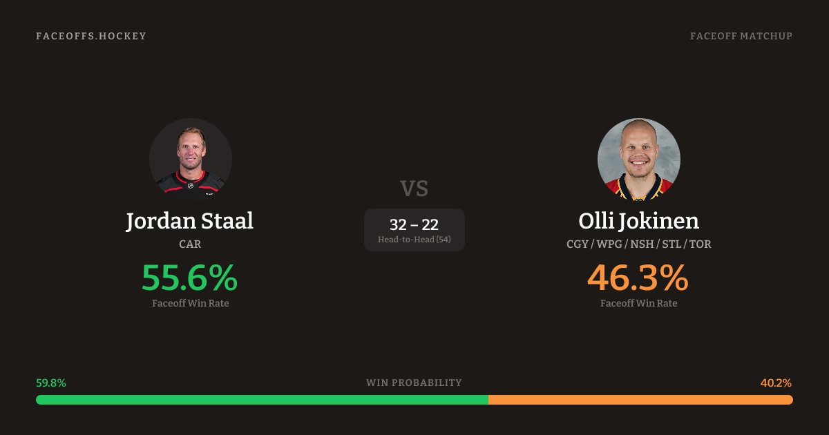 Jordan Staal holds a +2.5% FO% edge overall. Look for Staal on defensive-zone draws (70% H2H, 10 meetings).