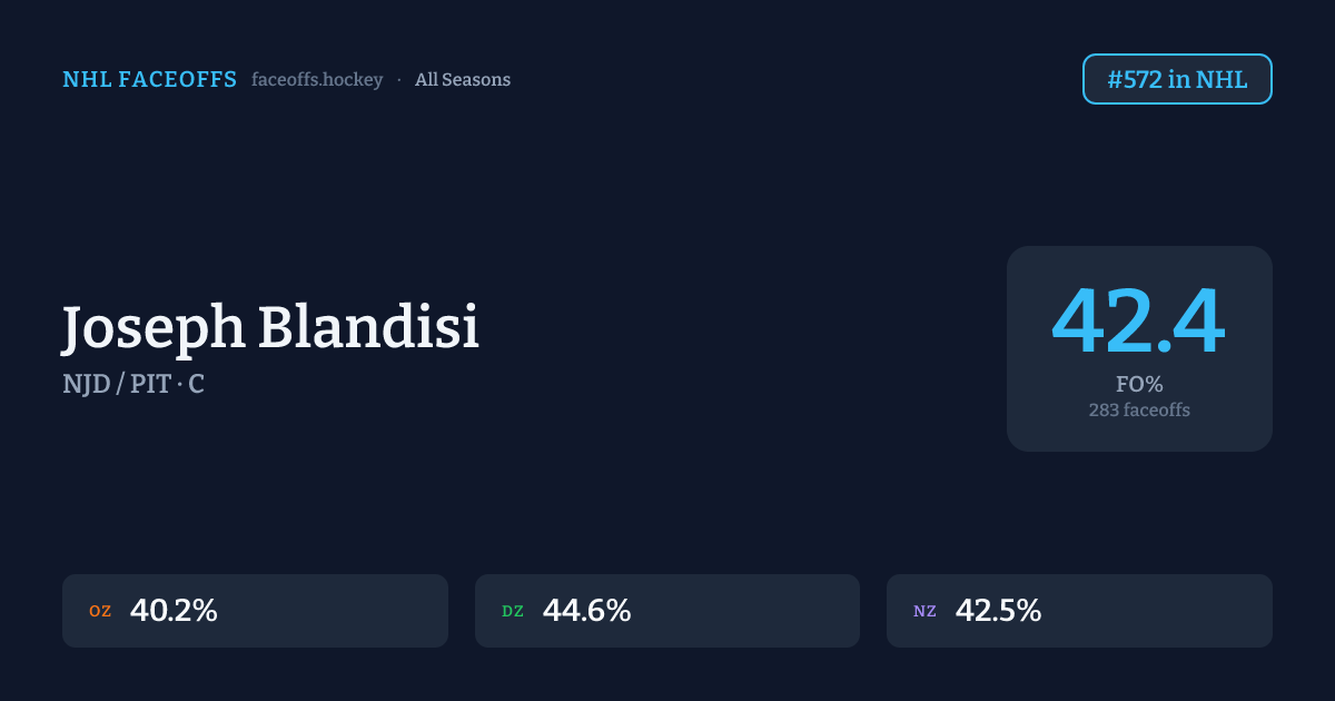 Joseph Blandisi has a career faceoff win percentage of 42.4% across 283 faceoffs. Best zone: Defensive (44.6%). Ranked #572 in the league.