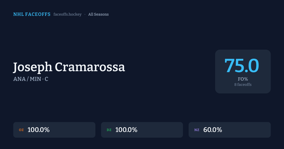 Joseph Cramarossa has a 2022-23 faceoff win percentage of 0.0% across 1 faceoffs in the 2022-23 season. Best zone: Neutral (0.0%).