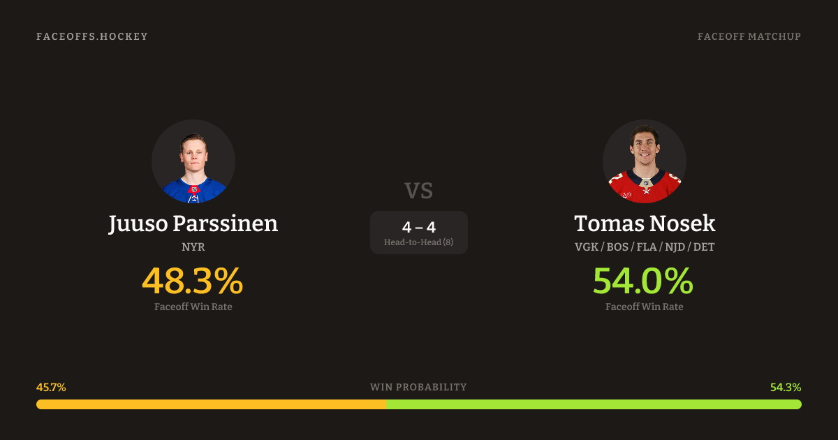 Tomas Nosek holds a +4.9% FO% edge overall. Look for Nosek on neutral-zone draws (60% H2H, 5 meetings).