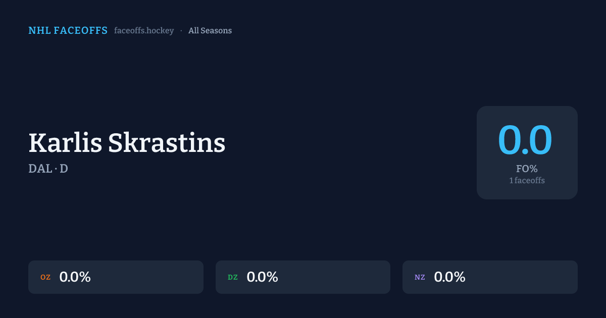 Karlis Skrastins has a career faceoff win percentage of 0.0% across 1 faceoffs. Best zone: Neutral (0.0%).