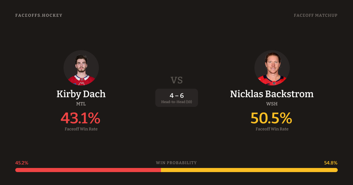 Nicklas Backstrom holds a +13.6% FO% edge overall. Look for Backstrom on neutral-zone draws (60% H2H, 5 meetings). Dach wins 31.7% vs left-shot opponents — Backstrom shoots left.