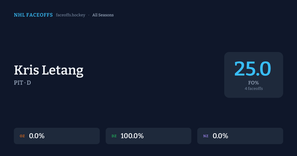 Kris Letang has a 2010-11 faceoff win percentage of 100.0% across 1 faceoffs in the 2010-11 season. Best zone: Defensive (100.0%).