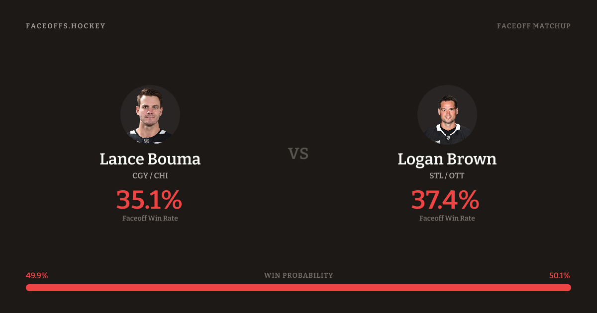 Logan Brown holds a +2.3% FO% edge overall. Bouma wins 38.3% vs left-shot opponents — Brown shoots left.