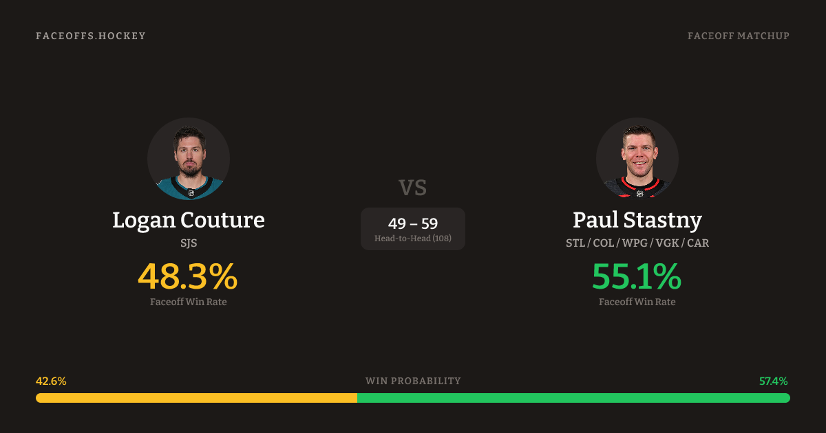 Paul Stastny holds a +16.3% FO% edge overall. Look for Stastny on defensive-zone draws (100% H2H, 3 meetings). Couture wins 42.5% vs left-shot opponents — Stastny shoots left.