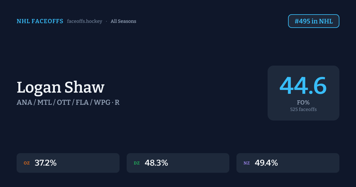 Logan Shaw has a career faceoff win percentage of 44.6% across 525 faceoffs. Best zone: Neutral (49.4%). Ranked #495 in the league.