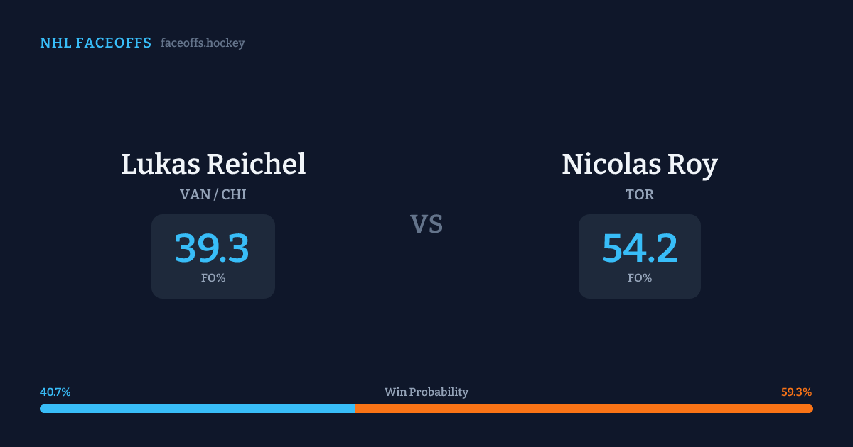 Nicolas Roy holds a +7.8% FO% edge overall. Look for Roy on offensive-zone draws (67% H2H, 3 meetings). Reichel wins 39.4% vs right-shot opponents — Roy shoots right.